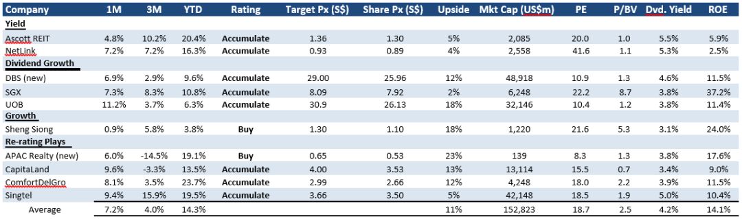 辉立绝对回报10大选股投资组合在2019年二季度上涨了6.6% (2019上半年增长14.2%)。我们的回报和股息增长建议都是优于业绩表现的。成长股和金融股的表现再次令人失望。虽然如此,我们仍将UOB 和SGX 保留在投资组合中。SGX 在强劲的衍生品业务支持下,应能发布健康的盈利业绩。Keppel DC REIT 已突破我们的目标价位。我们将用DBS集团控股将其替换。本季度,我们提高了金融股的权重。银行股提供接近5%的可观股息收益率,我们预计股息还会增长。由于贷款重新定价的延迟,息差可能会逐渐上升。值得注意的是,2019年二季度的SIBOR 实际上已上涨了6个基点。交易收益将从全球债券上涨中获得提振。贷款增长是其薄弱环节,但这已是众所周知的了。我们剔除了China Sunsine,并以APAC Realty取而代之。我们减少了对REITs 的敞口。我们认为,预计随着美国今年将会加息三次,新加坡的租金回归或有机增长将放缓。无机增长可获得,但估值更不合理。