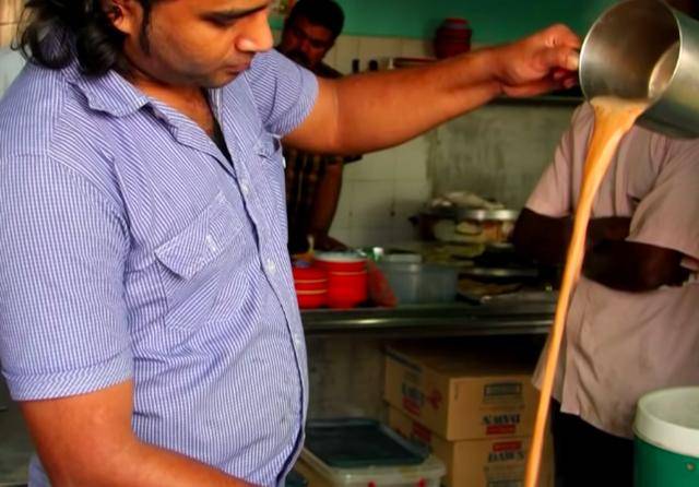 同样来自于马来西亚的印度移民,用两个杯子远距离倒来倒去,将奶茶和香料均匀的混合。当温度适中,再加入炼乳就可以喝了。