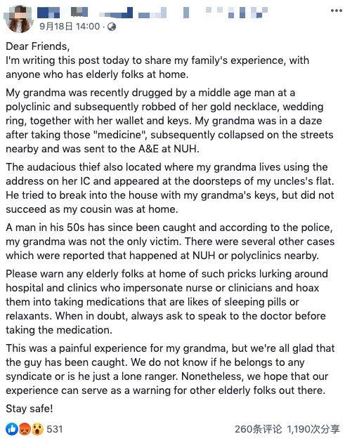 其中一名受害者家属Evelyn Tan在Facebook发文称,自己的阿嫲在综合诊所被一名中年男子下药迷昏后打劫,被抢走金项链、结婚戒指、钱包和钥匙。