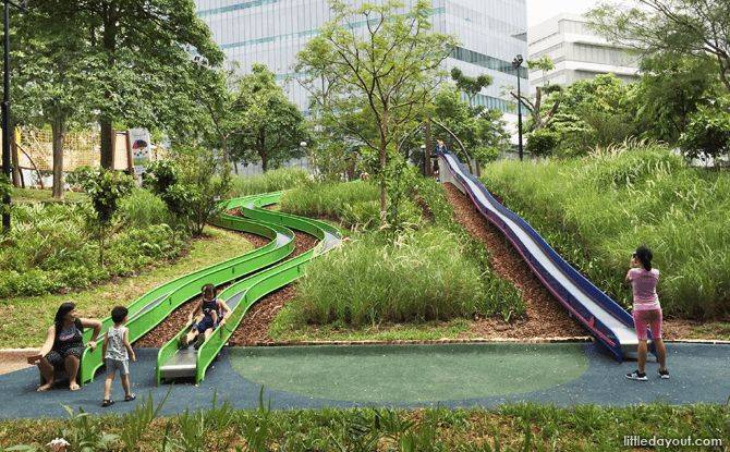 长长的滑梯在绿色植物的包裹下显得格外童趣~