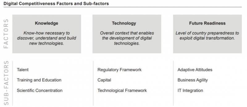 这个排行榜共针对全球63个经济体,根据知识、技术和“未来的准备状况”(future readiness)三个指标评估各国和地区的数码竞争力,三个指标中又细分为九个标准,分别是: