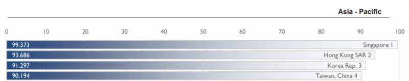 在亚洲国家中,新加坡排名第一,接下来依次是中国香港(排名第八)以及韩国(排名第十)。