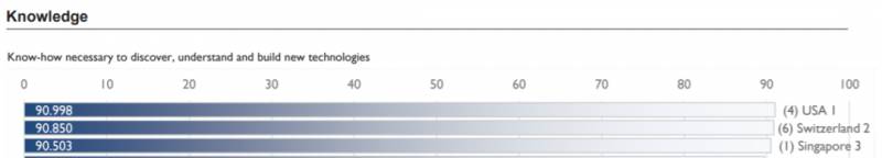 从整体上来看,新加坡在技术方面一直名列第一,只是今年在知识方面下滑了两个名次,被美国和瑞士超越。