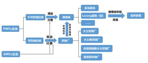 PWCs企业提供的特殊垃圾清运服务只为居民提供服务,服务范围不包括工商业。新加坡工商业垃圾由GWCs企业处理,GWCs企业是新加坡环境局批准的一批持有执照的废物收运商,专门负责特殊垃圾的收运及处理。NEA及各GWCs运营商在其网站上列出各类废物收集清运的具体操作过程,以便工商业者选择服务。工商业垃圾经过分类收集后运至专门的处理场所回收或处理,工商业者与环境局签订协议后也可将垃圾送至国有焚烧厂或转运站处理。