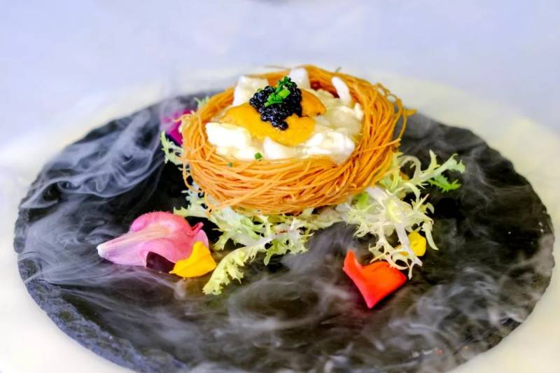 用蛋白模仿而成的蟹肉,搭配海胆和“海中黑珍珠”,