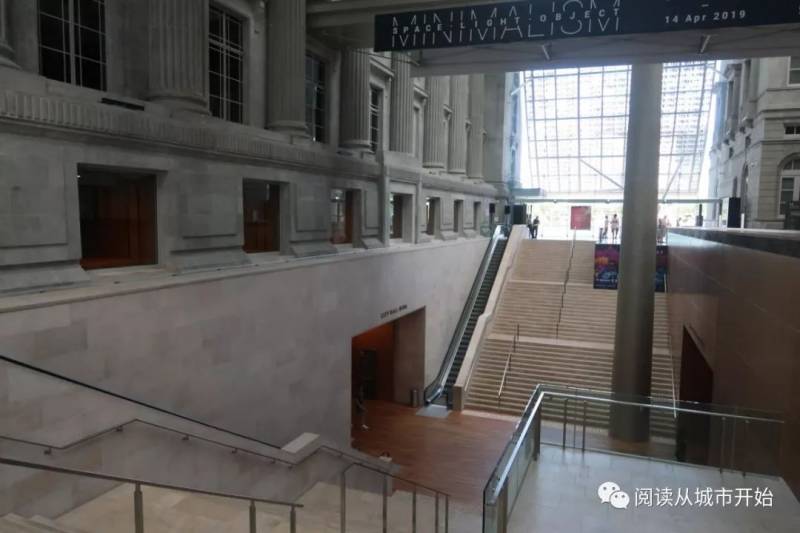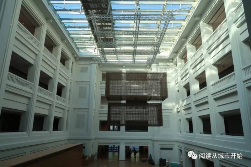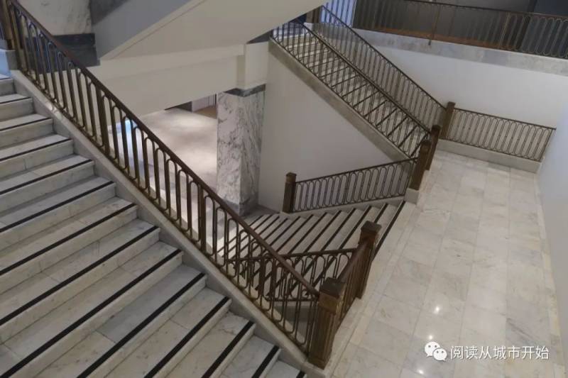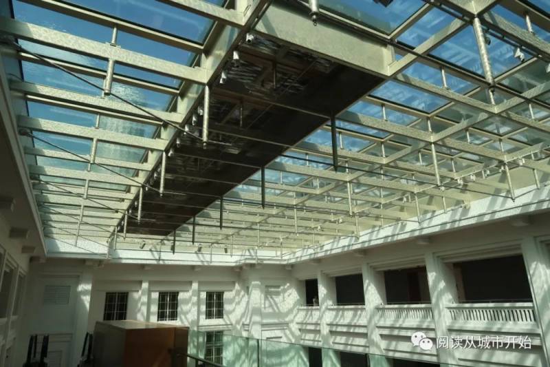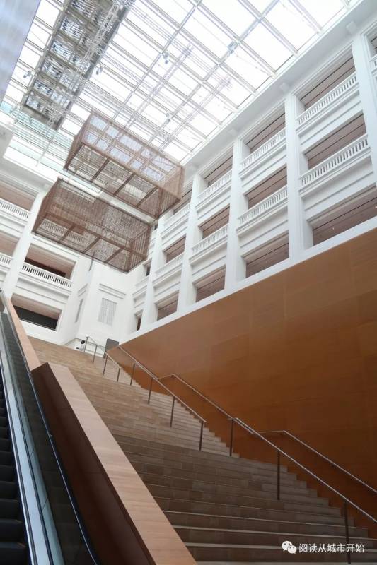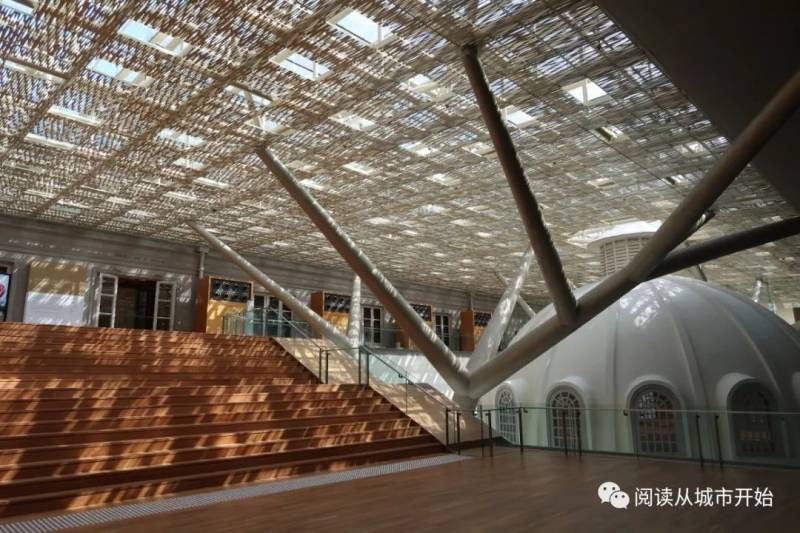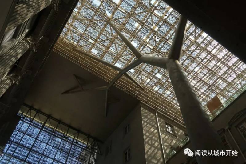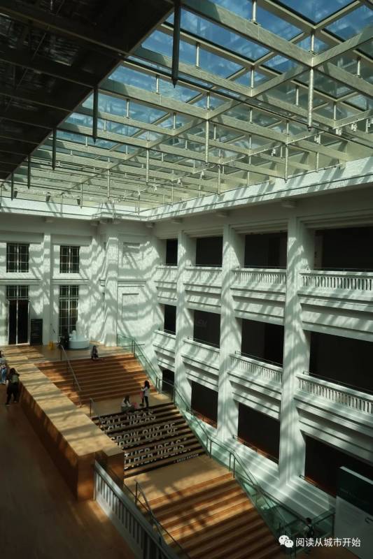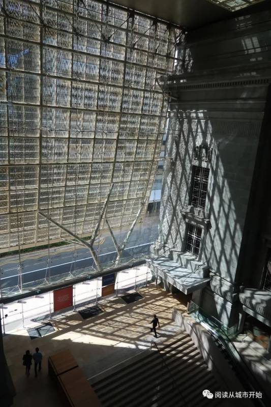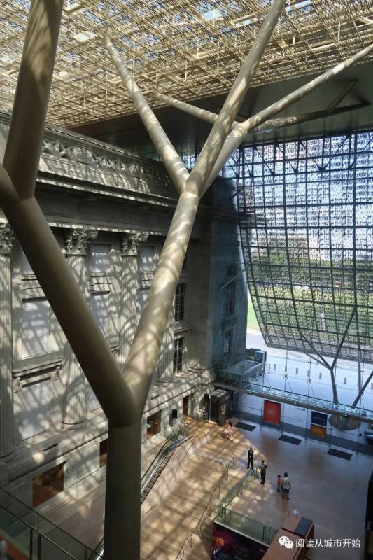 原来两栋历史建筑的距离在大屋顶的覆蓋下变成了主要的入口空间,宏大而有特点,外立面变为了内部墙面,巨大的罗马柱,空间极具戏剧的张力
