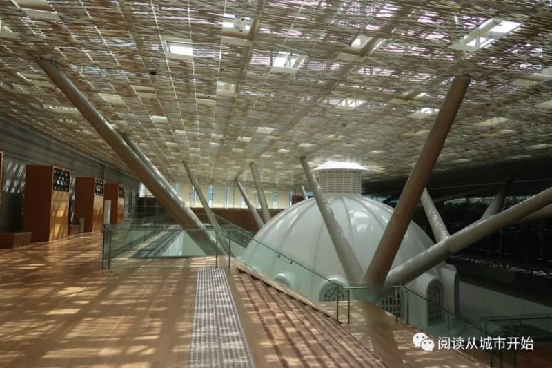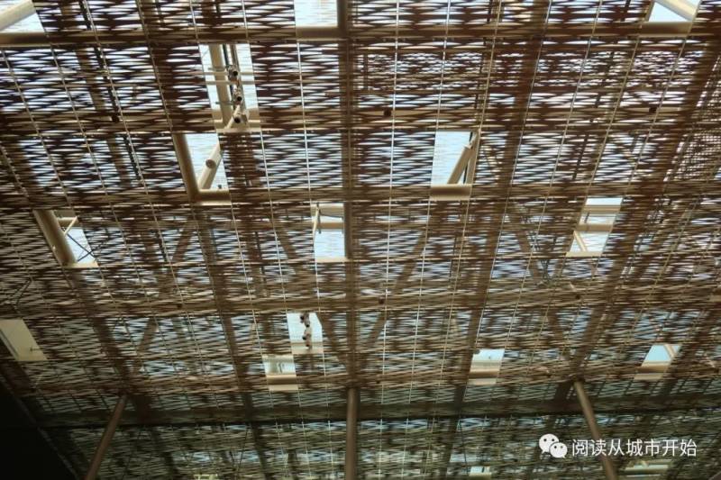 屋顶的树枝状支撑结构很美,屋顶是可以透露天光的,独特的纹路设计,让整个美术馆里充满了“森林感”!15000个铝板平铺而成的黄金屋顶,晴好的时候光线倾泻入这个空间,而且随着光影流动,这感觉很好。有一侧的屋顶上面有个水池,波光粼粼的流动,所有的光影交错映衬在白色的墙壁上,我静静听了很久,氛围塑造的也太有静谧感了,觉得这个设计师很注重细节的体验。