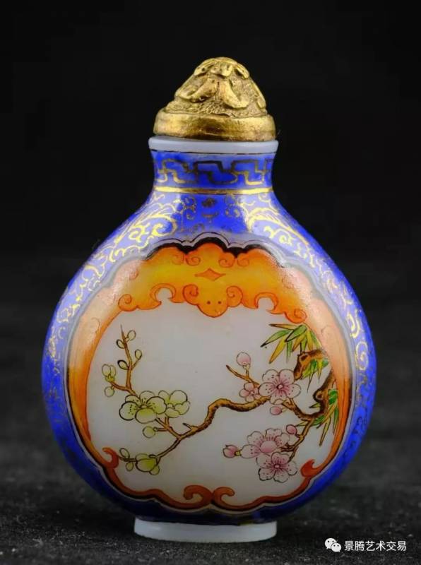 开光梅菊蓝边描金瓷 鼻烟壶。