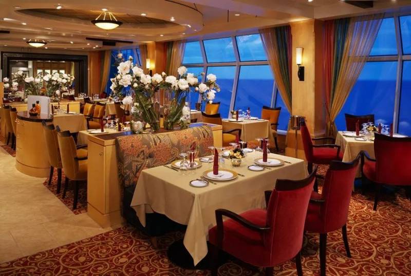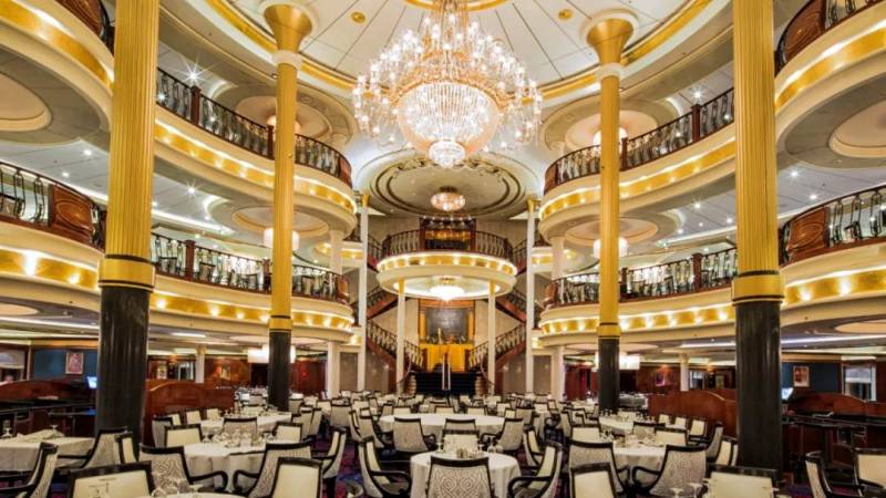 蓝宝石主餐厅挑高三层,位于3、4、5层船尾,如欧洲宫殿般气势恢宏,让您在水晶灯与蔚蓝大海间体验皇家的奢华,在悠扬乐曲中细细品尝来自各国名厨的倾情奉献。餐厅提供早、午、晚三餐,其中午餐、晚餐均是三道式标准,前菜、主菜和甜品,每天不同,顿顿都有不一样的惊喜。