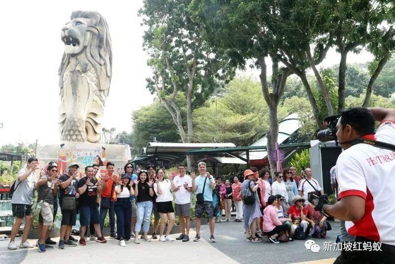 游客们争相与圣淘沙鱼尾狮合照。(联合早报)