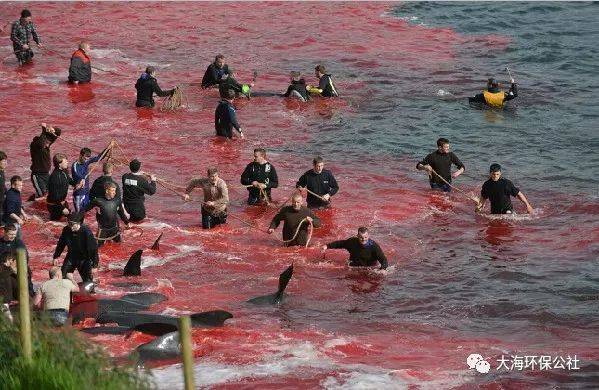 据英国《镜报》8月5日报道,近日,在丹麦法罗群岛的Hvalvik湾,人们捕杀了23头鲸鱼以获取鲸肉和鲸脂,海水被鲜血染红。