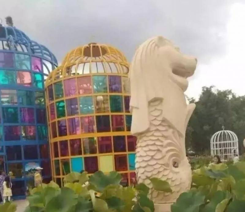 越南网友表示,在宾馆门口竟然出现了小小的鱼尾狮迎客!