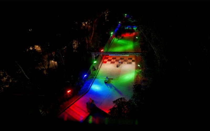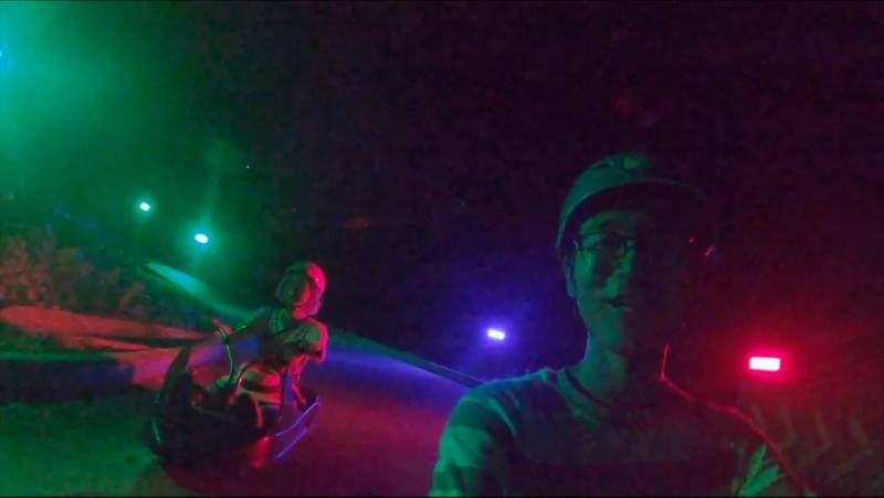 这个高空滑车白天晚上都可以坐,白天的话视野更好,晚上虽然黑漆漆一片,但滑道上设计了彩色的灯光,颇有一种光怪陆离的感觉。