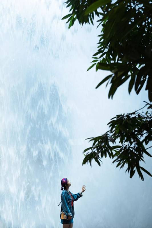 从不同的角度看瀑布感觉是不同的,从高处看,它在树叶的掩映之中,颇有一种世外桃源的氛围。从低处看,水在巨大的玻璃上滚滚流淌,人们好像是冲入瀑布的鱼群,享受着一种被水环抱住的清凉: