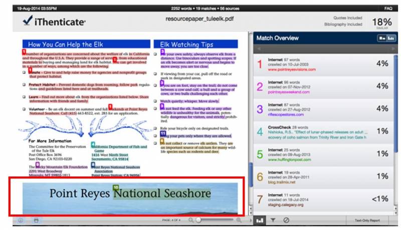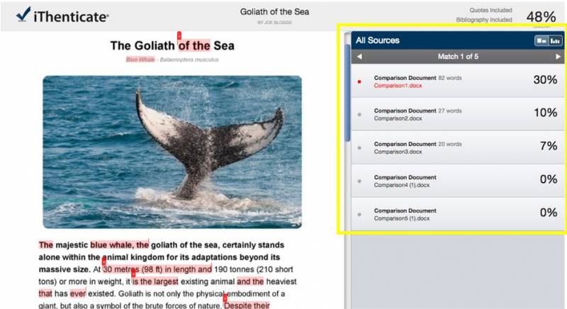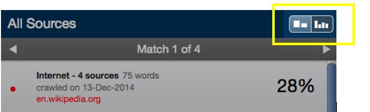 "iThenticate"贴心地提供并列视图,方便大家能一眼看出论文与数据库中重复程度的对比结果。