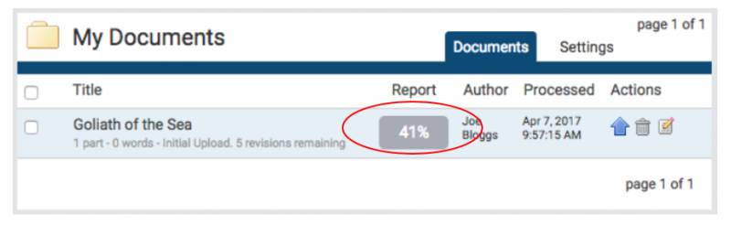 我们可以在文件夹的"Documents"选项卡中查看重复率报告。此时显示的百分比显示全文与数据库中的文章对比之后的重复率。