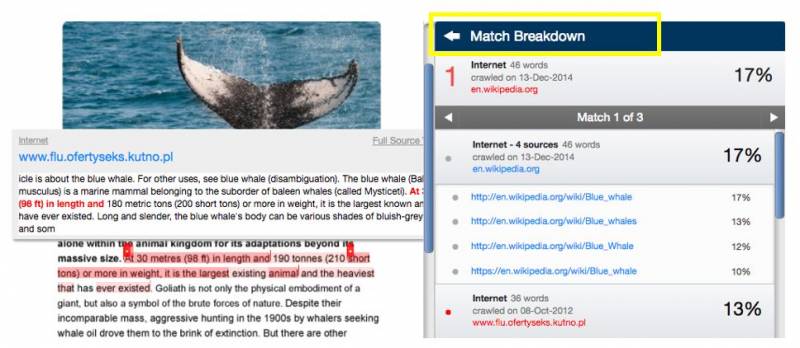 内容追踪报告列出数据库和提交的文档之间的所有匹配项。由于数据库定期更新,它可能有许多来自同一来源的匹配项。与作者以前的作品匹配较大的文章可能会隐藏在其他文章中的较小段落。内容跟踪将显示与每个源重叠的全部范围。