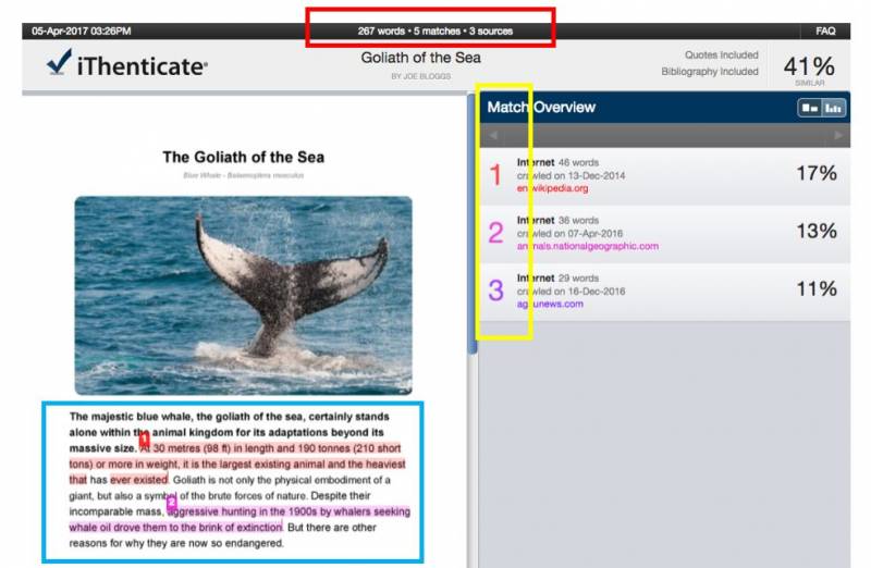 第一部分:在屏幕的顶部,文档信息栏显示了提交论文的重要细节。这包括文档标题、处理报告的日期、字数和在所选数据库中找到的匹配来源的数量。