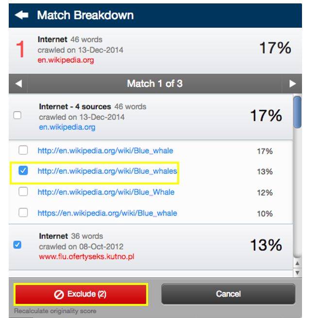 若要排除匹配的重复项,我们单击匹配细节模式的箭头图标,选择排除来源以进入来源排除模式。通过选择每个来源旁边的复选框,选择要删除的单个或所有来源。单击"Exclude"按钮来排除来源。