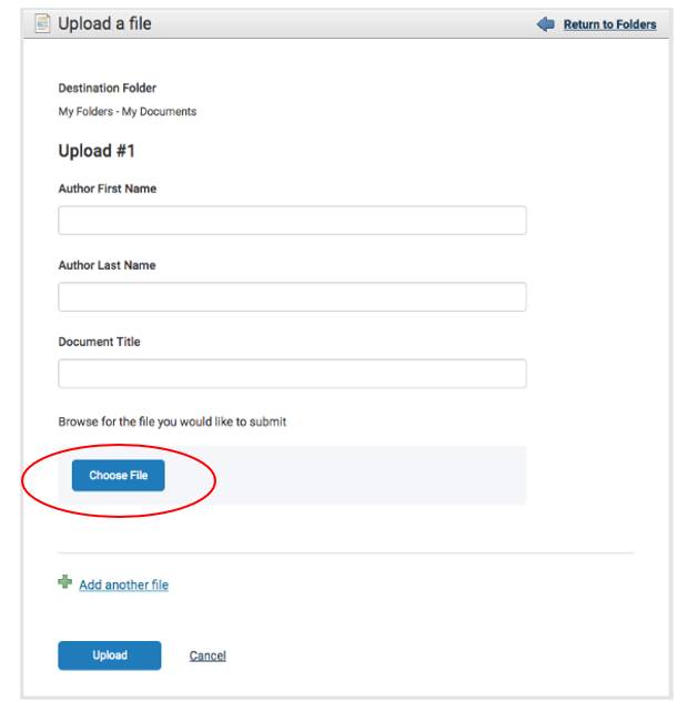在上传文件页面上,输入作者详细信息和文档标题。选择"Choose File"并上传我们的论文。