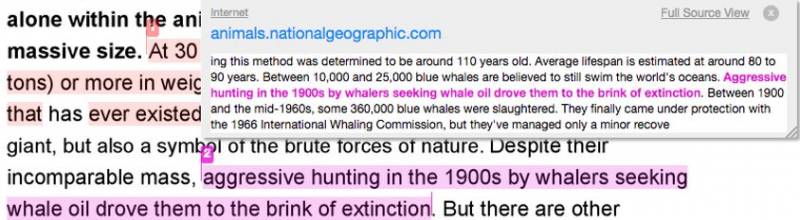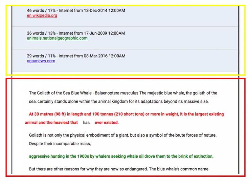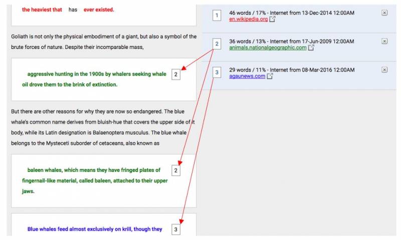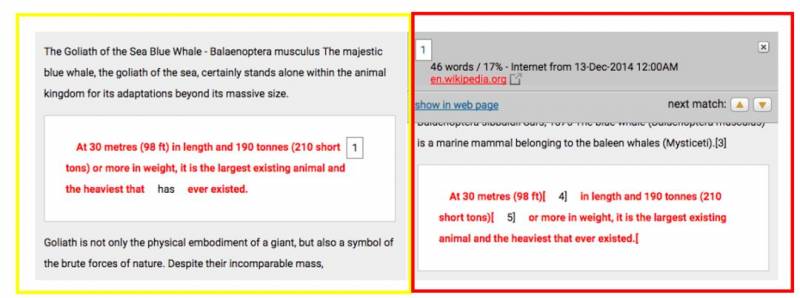 下面给大家看个"栗子"。来源列表中将来源A显示为40%重复率,并显示完整的160个单词,然后将来源B显示为10%重复率,并显示与来源A不重叠的40个单词。