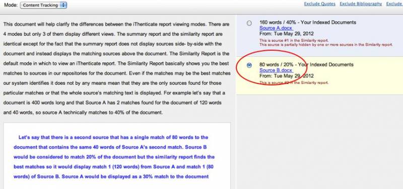 在前一个示例中,使用相同来源信息的内容跟踪模式将在来源列表中显示两个来源,显示每个来源的匹配单词总数和匹配百分比。来源A显示160个单词和40%的重复率,来源B显示80个单词和20%的重复率。