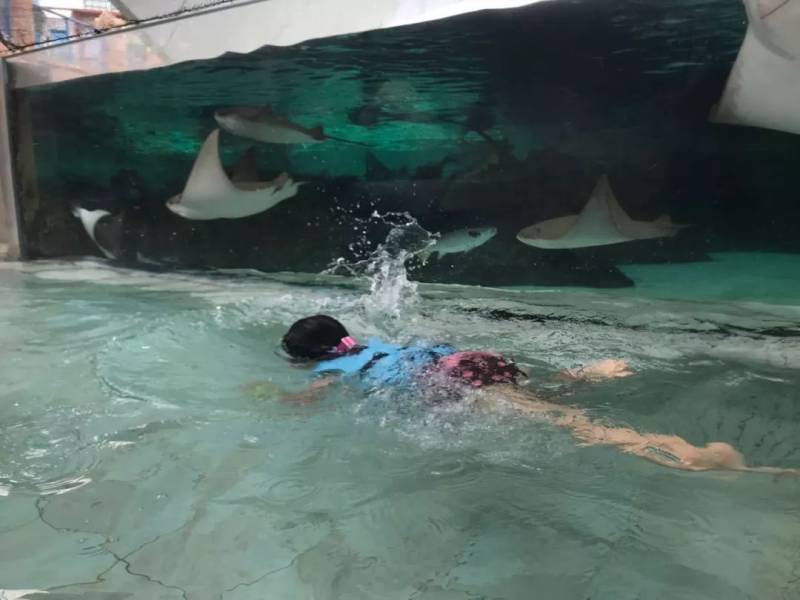 这是个可以浮潜的项目,可以在游乐区域里与很多海洋生物一起玩耍,所以排队人很多,身高要求107cm以上,5人一组,每次只能玩10分钟,排队的人很多,这里免费提供救生衣/面镜/呼吸管,介意者可以自带。