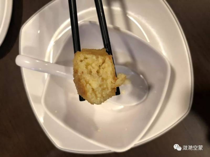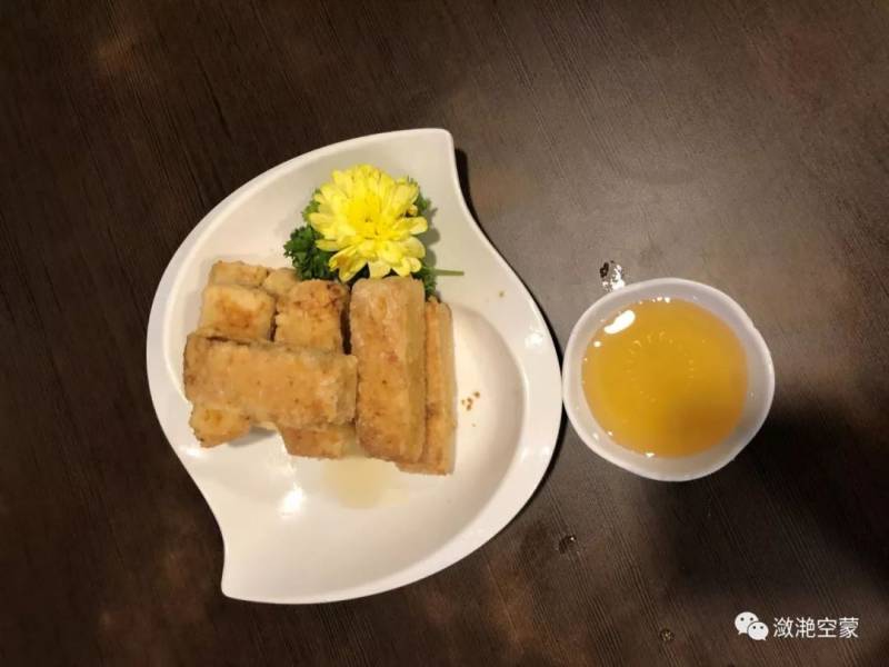 豆腐:豆腐掏空,装了海鲜馅料,外皮酥脆,内里绵软鲜香,沾了边上有点甜味的酱汁,解腻爽口。