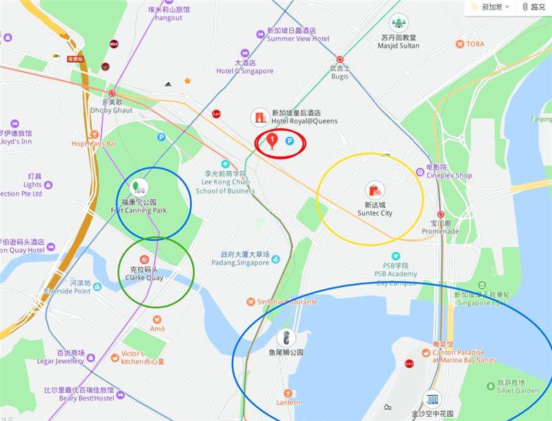 新加坡国家不大、城市也不大,地铁好像就五条线,五种不同的颜色,辨识起来很方便,记得红色地铁线还有中文报站。从机场到酒店我们是跟着百度地图走的,转了一条地铁,加上步行导航,语音提示非常清楚,完全不用担心迷路,也省去了问路的尴尬和障碍。