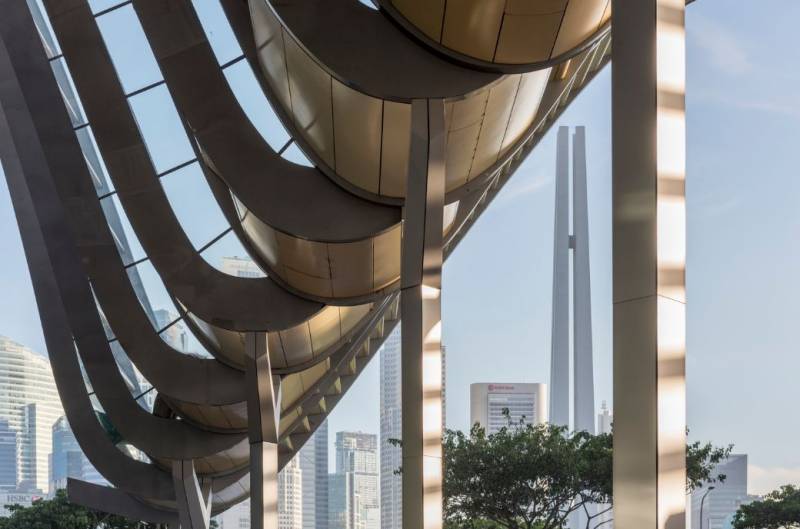 两座相互联系的大厦分别矗立在场地南北两面,并由“绿色脊柱”相连。南面的大厦分为酒店和住宅公寓,北面的大厦为办公楼。它们的立面延伸出一道缓和的曲线,延续了下方波浪形顶篷的设计语言。