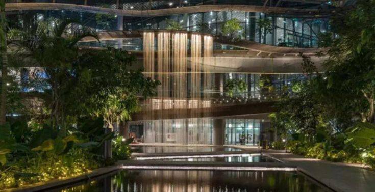 建筑本身就如一座布满了绿植的大山,四幢高楼大厦围绕着建筑物中间的中心花园,是这个设计另一个特殊点。设计受到亚洲梯田的启发,四座塔楼围合一个绿色中心“绿色心脏”,由德国著名建筑设计公司克里斯多夫完成。