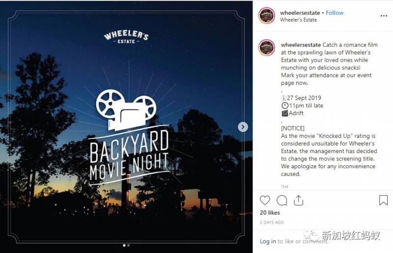 他们曾经也举办过户外电影院活动,反响很好,草坪上挤满了前来野餐和观赏电影的访客。在来临的9月27日,Wheeler’s Estate将再度举办户外电影院,蚁粉们不妨抽空去凑凑热闹,这种复古式星空下看电影的体验,带上亲朋戚友或是另一半都可以收获不同的体会哦。