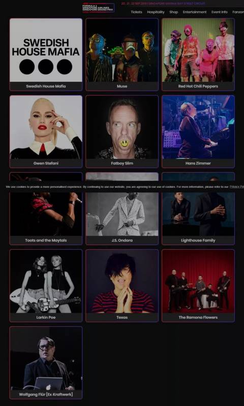 除比赛外,丰富的周边活动一直是F1的一大看点。著名摇滚乐队Muse将在周六(21日)的排位赛后献唱。将在F1周末期间献唱的乐队还有瑞典浩室黑手党(Swedish House Mafia)、红辣椒乐队(Red Hot Chili Peppers)、Texas、Ramona Flowers、Toots and the Maytals等等。献唱的歌手有格温·史蒂芬妮(Gwen Stefani)。