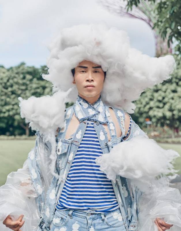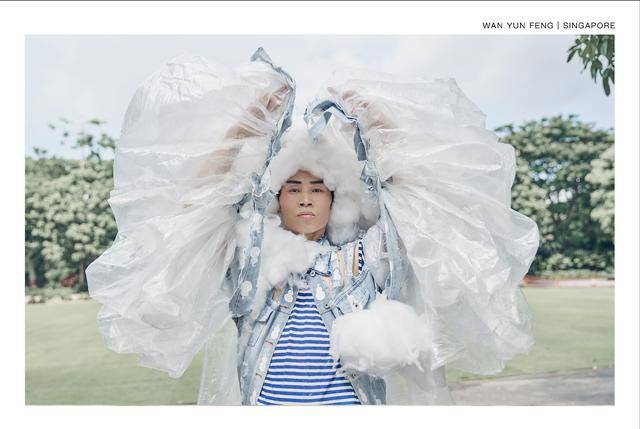 整身服装的设计都是运用了破旧牛仔的不规则再造,袖子上镶嵌了大量的白色半透明编织袋来营造“云”的视觉感,废物再利用在万先生的设计中无处不在,打破常规的设计风格体现在万云峰的很多作品中,他的每一个作品都让人眼前一亮。