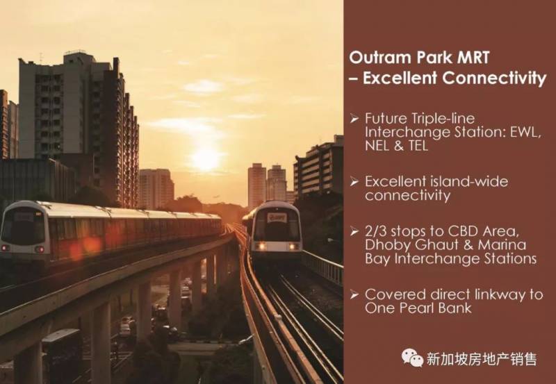 只需要步行约两百米就可到达欧南园地铁转换站(Outram Park MRT)。该地铁站目前营运的是东西地铁线(East West MRT Line)和东北地铁线(North East MRT Line )。正在建设中的汤申-东海岸地铁线(Thomson East Coast MRT Line),也将在2021年全线通车。从欧南园地铁转换站,住户只需在东北地铁线往榜鹅地铁站(Punggol MRT)的方向乘搭1个地铁站就可以到达牛车水地铁转换站(Chinatown MRT),住户可以在该站转换到滨海市区地铁线(Downtown MRT Line),交通十分便利。