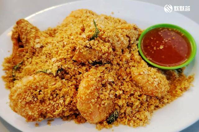 新鲜的虾仁再加上调味过的麦片一起去炸,炸的酥酥脆脆的,沾上一旁的酸甜辣酱,好好吃啊~~~