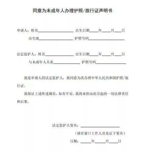 如果申请人未满16周岁,则须由一位法定监护人(父母或其他法定监护人)陪同到场并出具同意办理护照声明书(可在使馆填写)。
