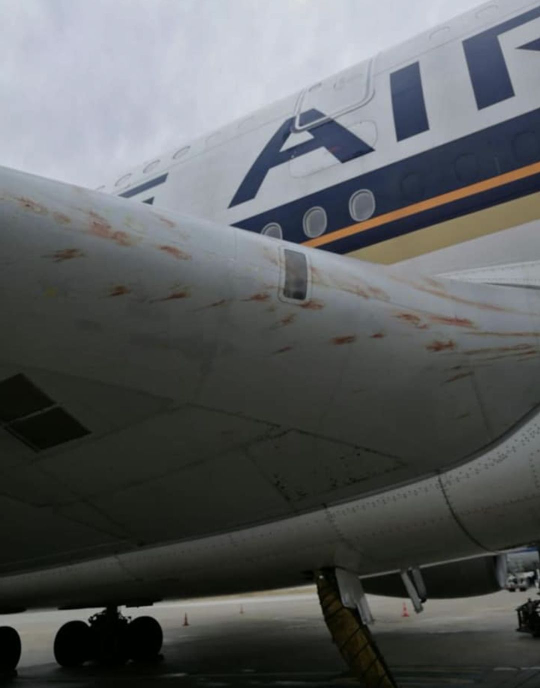 从新加坡飞往巴黎的新航SQ336班机,在7月11日(巴黎时间)早上降落戴高乐国际机场时,撞到鸟群,机身血迹斑斑,惨不忍睹!
