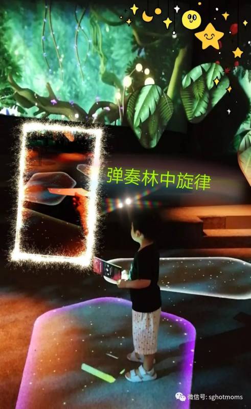 森林分馆是我最喜欢的分馆,恰到好处的昏暗很适合放松心情,手中的导览卡在这里化做指挥棒,只需在光影下轻轻晃动,就能弹奏出美妙的林中旋律,不同颜色的光影所触发的音色高低变换,让我过了一次当演奏家的瘾。小家伙更是兴奋的挥舞著导览卡在彩光下跳来跳去,看着孩子自己一边玩一边摸索规律,不禁感叹唯有这样独特的体验,才更能激发孩子对于科技的渴望。