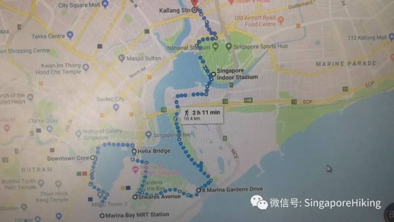 从加冷地铁站出发,穿过新加坡体育场,经过滨海湾东,上滨海湾堤坝,绕滨海湾花园,绕滨海湾上人行桥,到终点滨海湾地铁站。