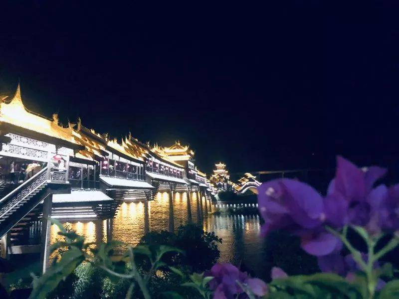 篝火晚会后,夜游风雨廊桥,在廊桥的另一头可以看到其全景,走进廊桥后,颇有“只缘身在此山中”的怅然,但站在桥上看濯水河又是另一番景象,河风给燥热的空气增添了一丝凉爽。