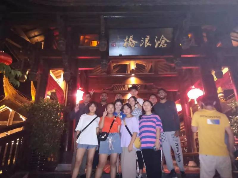 学子们在14日18点40分到达黔江濯水古镇,夜幕降临时的濯水古镇神秘又磅礴,首先映入眼帘的便是世界第一风雨廊桥——濯水沧浪桥,彼时的沧浪桥灯光遍布,宛若身披金甲的长龙。