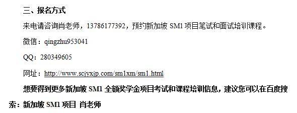 第三步:各省份SM1考生会在7月的某2天进行SM1的笔试和面试,其中第一天的考试科目是英语、数学、向性测试的笔试,第二天的考试科目是英语面试。一般情况下面试完当天或者隔一天出SM1的考试结果。SM1考试结果出来后的第二天,通过SM1的考生和家长就会参加新加坡SM1全额奖学金项目的签约仪式。