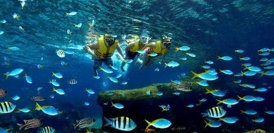 到七彩珊瑚世界中快乐浮潜,和近在身边的两万只友善鱼儿一同‘礁游’。看着热带鱼群自由自在地穿梭于珊瑚礁间,时而露面,时而消失,多奇妙!