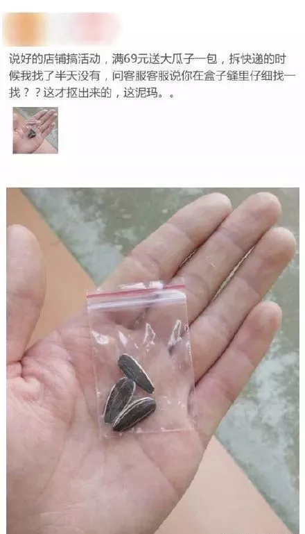还有网友冲着“满69元送大瓜子一包”的口号在一间店铺下单,结果货到时看到这“一包大瓜子”,内心崩溃了!