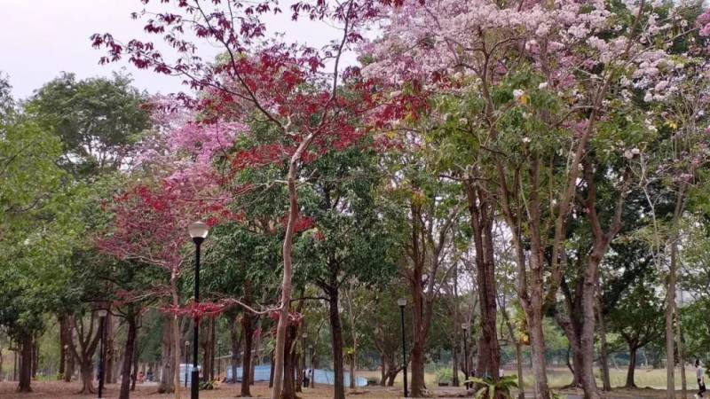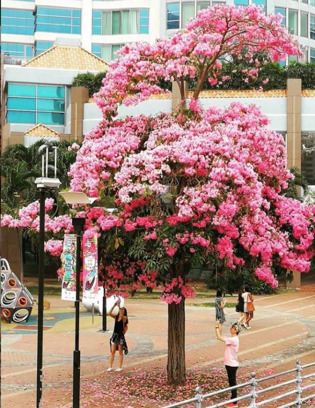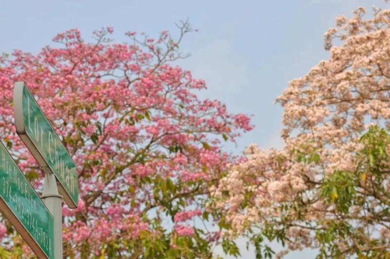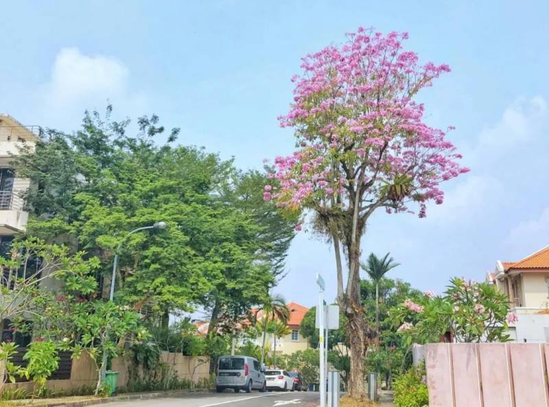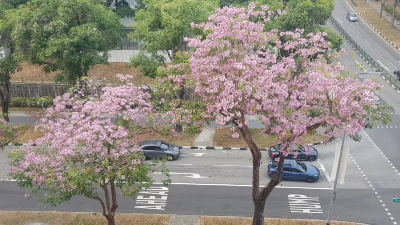 在新加坡最常见的紫花风铃有粉色、紫色和白色的。