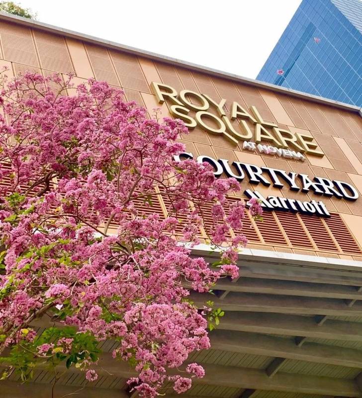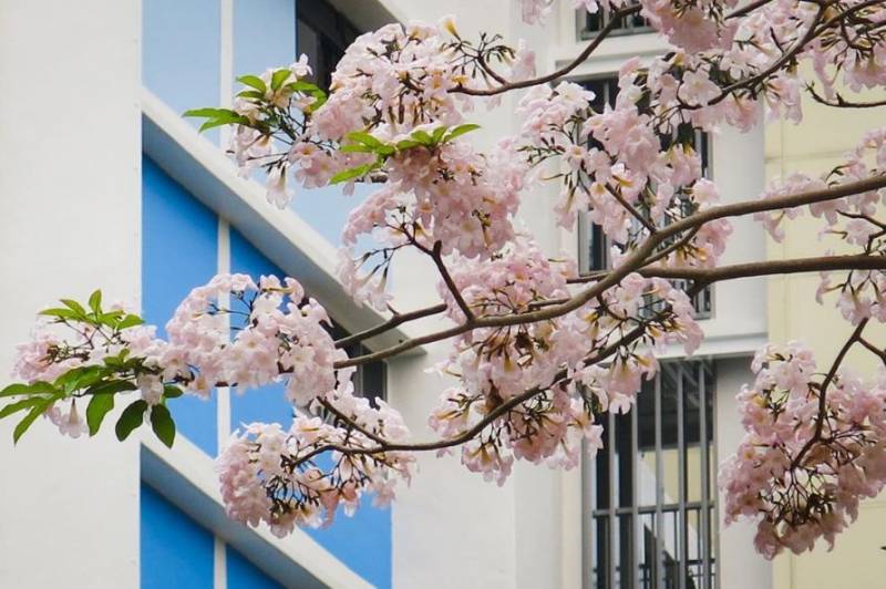 如果不仔细看,真的以为是新加坡有了“樱花季”。但其实这是新加坡很常见的的紫花风铃,俗称为“喇叭花树”。