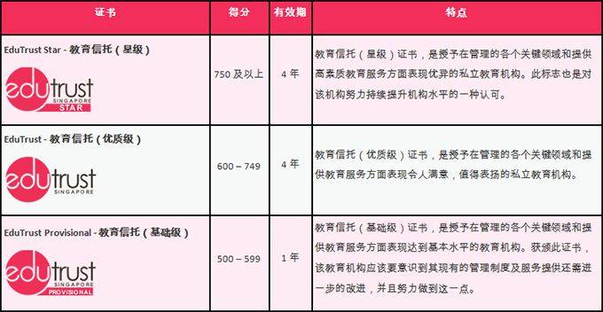 无论私立大学、中学、预科学院、语言学院等,只有取得EduTrust认证的私立院校才具有招收国际学生的资格,可以为国际学生办理学生签证,不通过EduTrust认证的私立院校将失去招收国际学生的资格。
