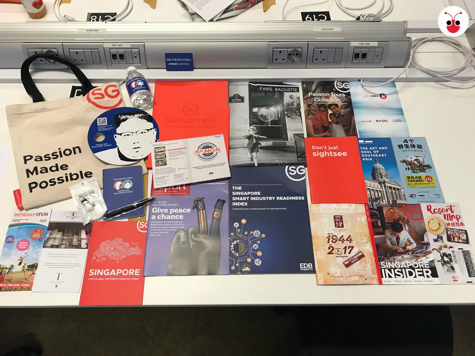红蚂蚁在媒体中心上下左右趴趴走,到处都能看到宣传新加坡的旅游局标语“心想狮城”(Passion Made Possible)以及新加坡食品厂商联合会旗下的新加坡制造“Made In Singapore”食品与文创品。