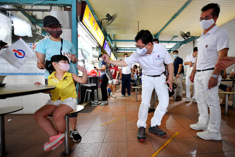 黄循财(右一)表示他只利用抗疫跨部门工作小组工作以外的时间去拜访其竞选的马西岭—油池集选区选民。(联合早报)社区感染人数增加与大选无关